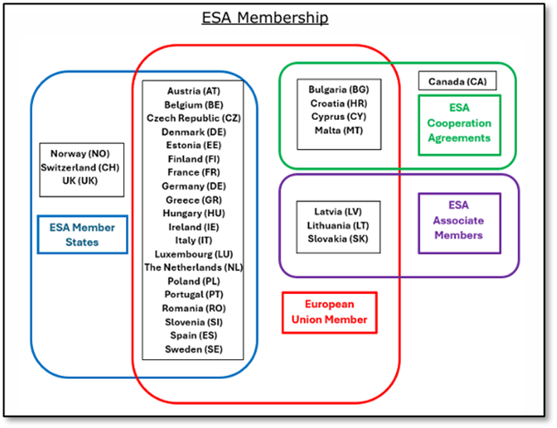 The main appeal of the ESA is scale: with 31 participating states, it is 2nd only to NASA in terms of annual funding (over $10B) and is Canada’s second biggest partner space agency.