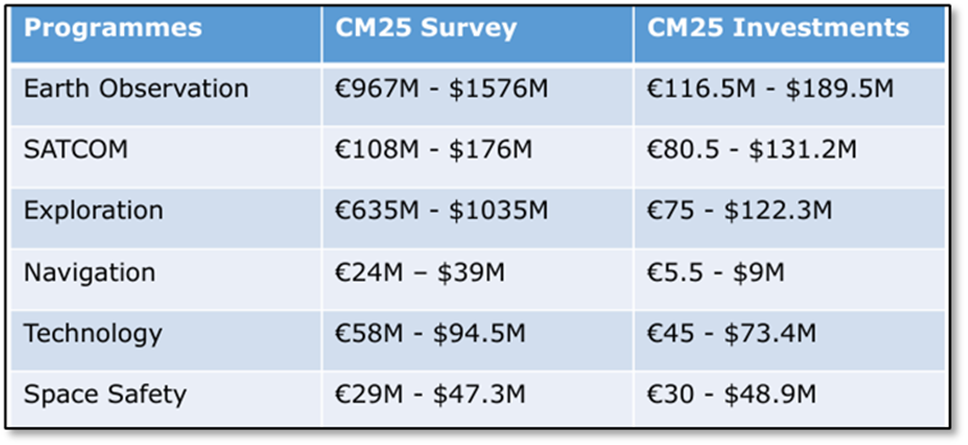 The financial weight given to each ESA program area matched the priorities reflected by Canada’s space industry in the CM25 survey.